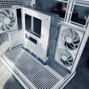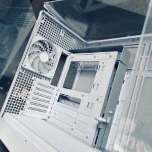 Im Gehäuse finden bis zu 10 Lüfter Platz, von denen bereits vier (alle 140 mm) vorinstalliert sind: drei unten (Boden), einer hinten. Im unteren Bereich können bis zu drei Lüfter installiert werden, die hinter einer Blende versteckt sind, sodass sie die Optik nicht beeinträchtigen. Die Front bietet Platz für drei 120- oder 140-mm-Lüfter. Im Deckel können maximal drei 120-mm-Lüfter oder diverse Radiatorgrößen von 120 bis 360 mm untergebracht werden. Hinter dem Mainboard-Tray befindet sich ein separater Kühlbereich, in dem bis zu fünf Lüfter montiert werden können. Hier lassen sich auch große Radiatoren (360 mm) installieren, die horizontal oder vertikal angebracht werden können. Dank dieser Vielzahl an Lüfter- und Radiatorplätzen eignet sich das Gehäuse optimal für umfassende Custom-Wasserkühlungslösungen und exzellentes Airflow-Management.