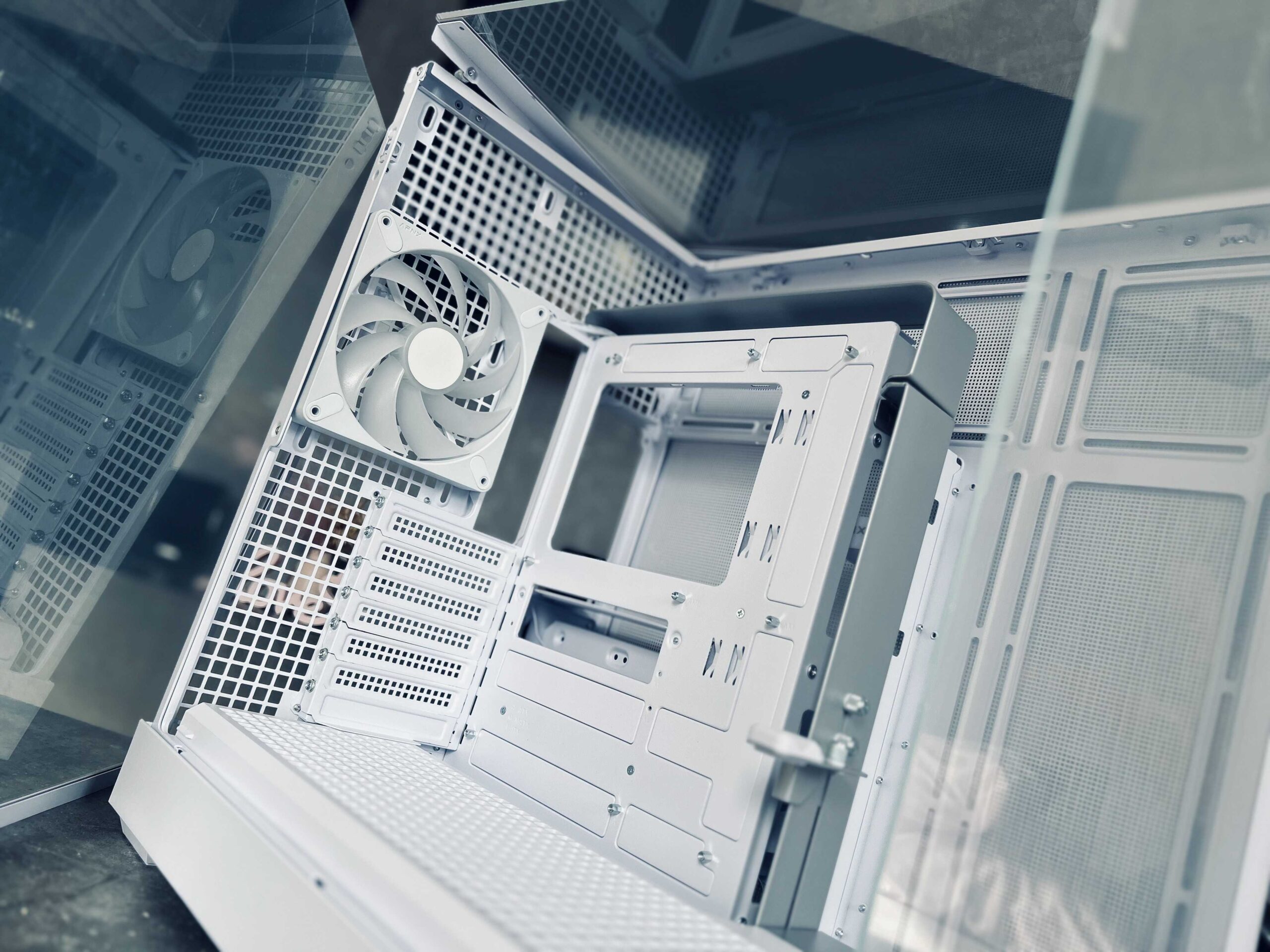 Das APNX V2 ist kein gewöhnliches PC-Gehäuse. Statt klassischer, geradliniger Formen setzt es auf ausgefallene Designakzente wie etwa eine diagonale, dreieckige Kante an der Verbindung von Front- und Seitenteil aus Glas, die dem Gehäuse eine markante und sehr eigenständige Optik verleiht. Maximale Sichtbarkeit mit Panoramaverglasung Drei große, entnehmbare Glasflächen an der Front, Seite und Oberseite ermöglichen einen fast nahtlosen Blick auf das Innenleben. Damit steht das V2 für maximale Präsentation der Hardware und eignet sich perfekt für Nutzer, die Wert auf eine auffällige, zugleich elegante Optik legen. Flexible Kühloptionen für Luft- und Wasserkühlung Das Herzstück des V2 ist sein durchdachtes Kühlkonzept mit weitreichenden Möglichkeiten: