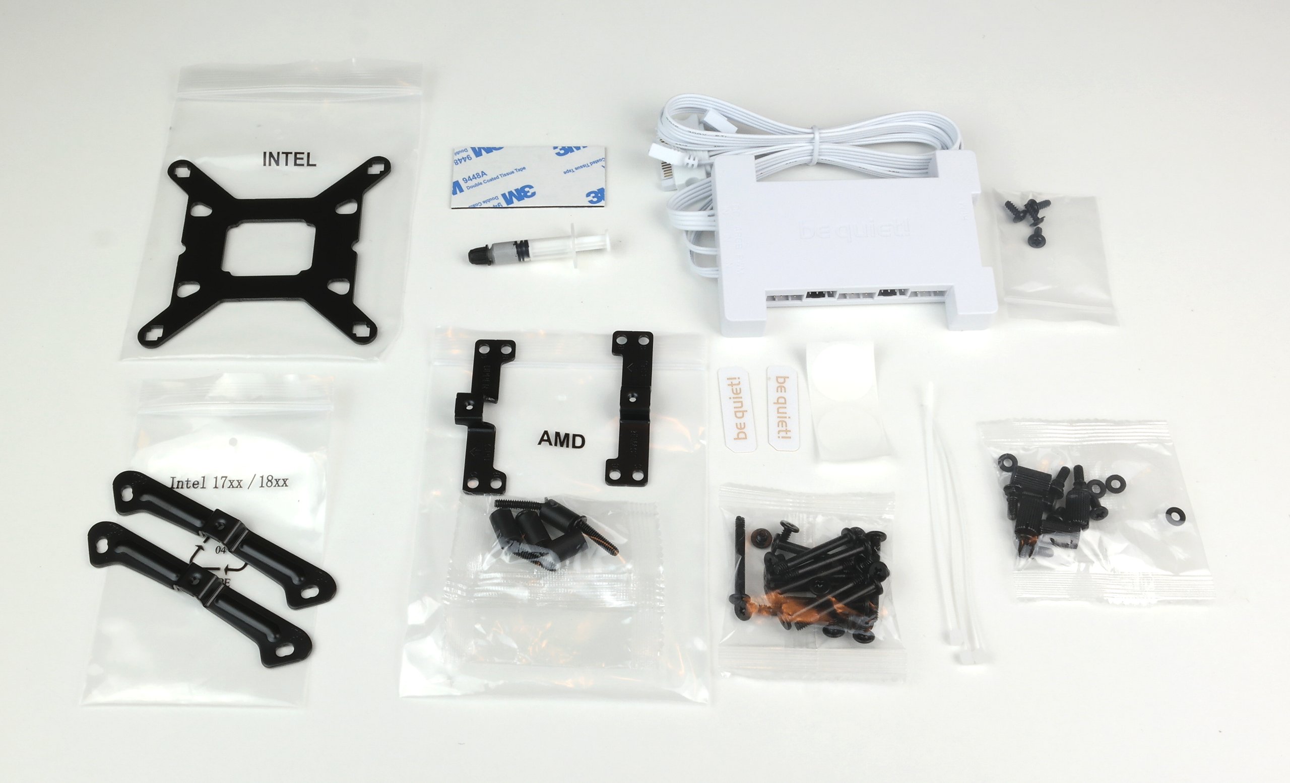 Die AiO-Kühlung wird mit umfassendem Zubehör ausgeliefert, darunter Montagematerial für AMD- und Intel-Sockel, eine verständliche Anleitung, Entsorgungshinweise, ein A-RGB-PWM-Hub mit Schrauben und doppelseitigem Klebeband, Kühlflüssigkeit zum Nachfüllen, drei Kabelbinder sowie zwei Sticker für den Nachfüllstutzen und zwei be quiet!-Logo-Sticker.
