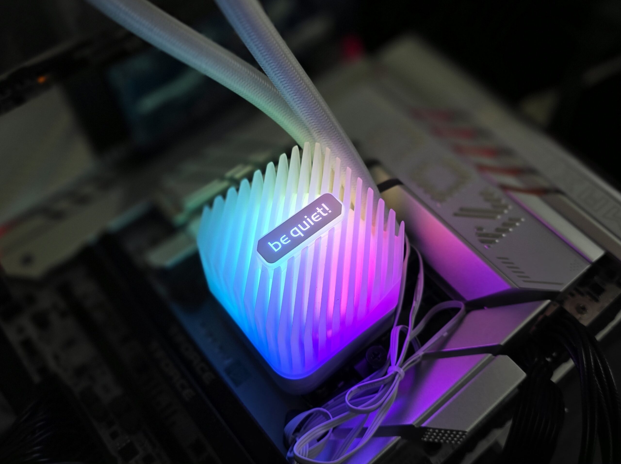Optisch auffällig ist der ungewöhnlich gestaltete Pumpendeckel, der an eine Kühlrippenstruktur erinnert. Die Kunststoffrippen sind rein dekorativ und werden von 16 A-RGB-LEDs in Szene gesetzt. Bei der weißen Variante ist die Abdeckung milchig und undurchsichtig, was zu einem eleganten, weichen Lichteffekt führt. Zentral auf der Abdeckung prangt das be quiet! -Logo.
