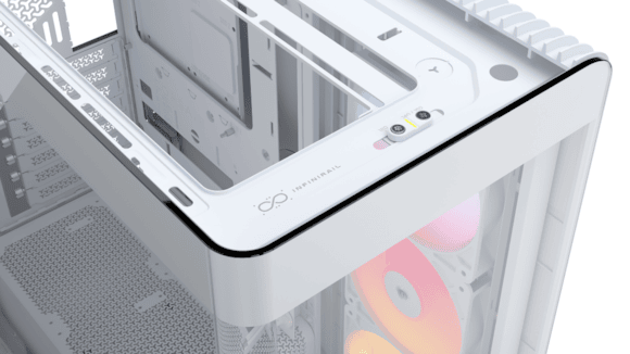 Das FRAME 4500X ist für herausragende PC-Setups gemacht. Dank des einteiligen Panoramaglases, das sich nahtlos über die Vorderseite des Gehäuses erstreckt, bietet es aus jedem Blickwinkel eine spektakuläre Aussicht. Hinter dem eleganten Design verbirgt sich eine ausgeklügelte Befestigung, die ein schnelles und einfaches Entfernen der gesamten gewölbten Scheibe ermöglicht, so dass Nutzer bequem Zugang zu einem geräumigen Innenraum mit nützlichen Funktionen haben, die den Aufbau eines PCs erleichtern. Eines der beliebtesten ist das InfiniRail-Lüfterhalterungssystem, eine von oben montierte, vom Benutzer verstellbare Schiene, die eine schnelle und einfache Installation von 120- oder 140-mm-Gehäuselüftern ermöglicht. Die Oberseite und die Seiten des Gehäuses sind für einen maximalen Luftstrom belüftet und weisen ein einzigartiges Muster auf.