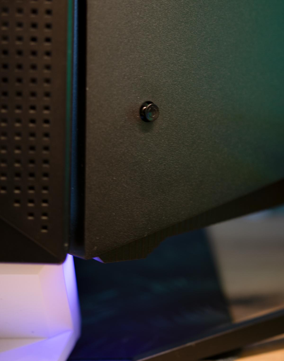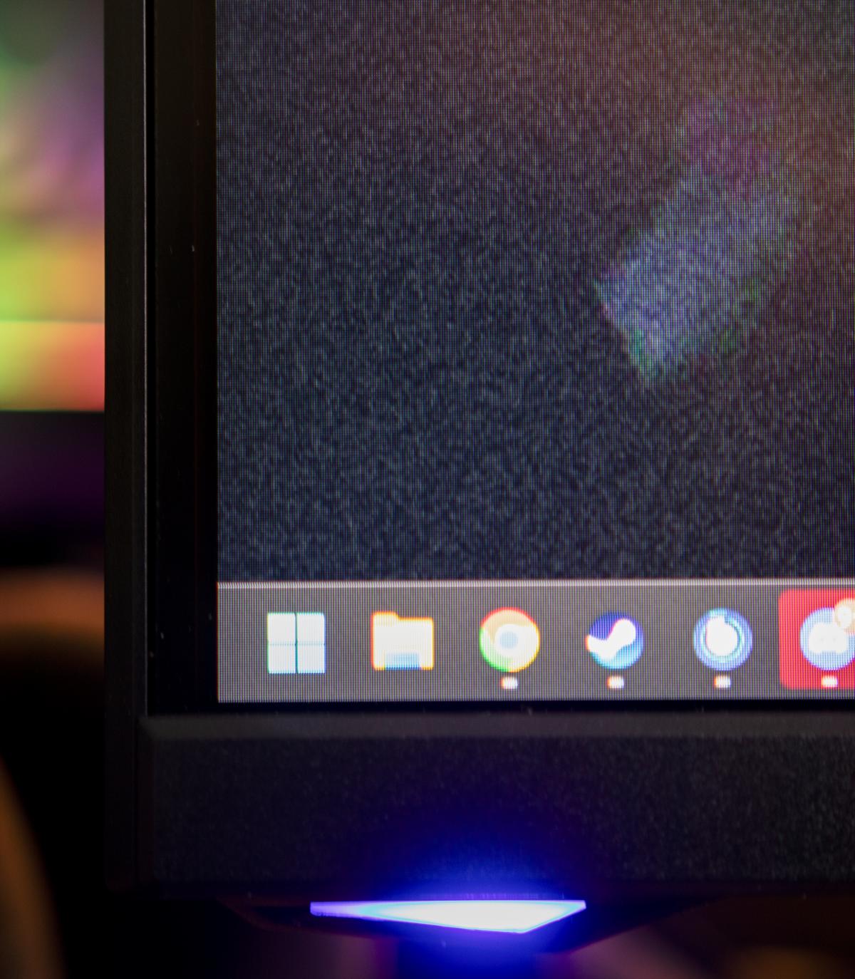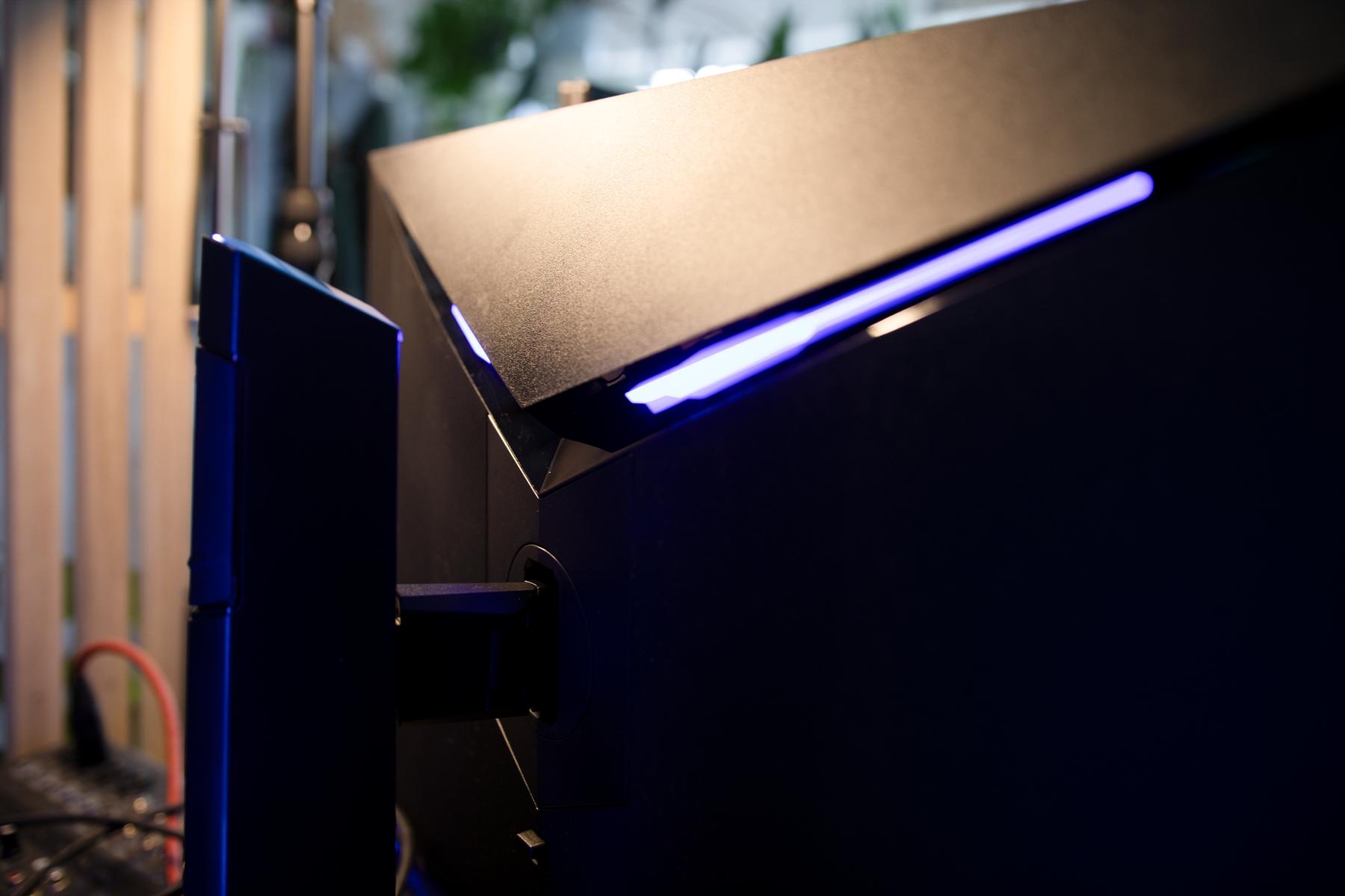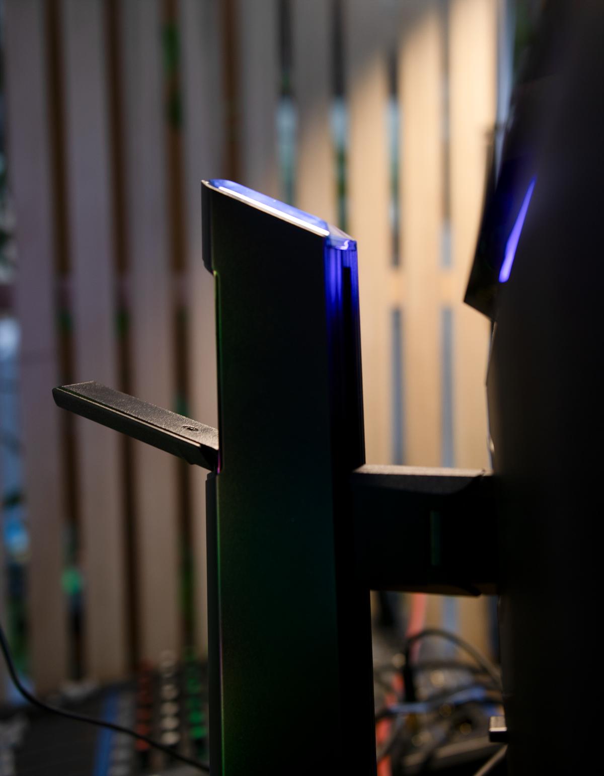 Der Standfuß macht einen wertigen Eindruck, hat sogar eine Kabelführung, was ja immer super ist, um wenigstens ein paar Kabel verschwinden zu lassen. Zudem hat er an der Rückseite einen Kopfhörerhalter, eigentlich ein nettes Detail, für meinen Gebrauch allerdings etwas ungünstig. Den Monitor an sich finde ich auch recht schick. Er hat jeweils links und rechts an der Unterkante blaue LED-Details und auch hinten eine blaue Ambientebeleuchtung. Ein weiteres blaues, diesmal metalloptisches Detail ist die Oberseite des Standfußes. Ich für meinen Teil benötige keine Ambientebeleuchtung am Monitor, aber wenn, fände ich es schon schöner, wenn man diese farblich einstellen könnte. Da mein Setup RGB im Farbwechsel beleuchtet wird, weiß ich nicht, ob ich die Beleuchtung in Zukunft anlassen werde.