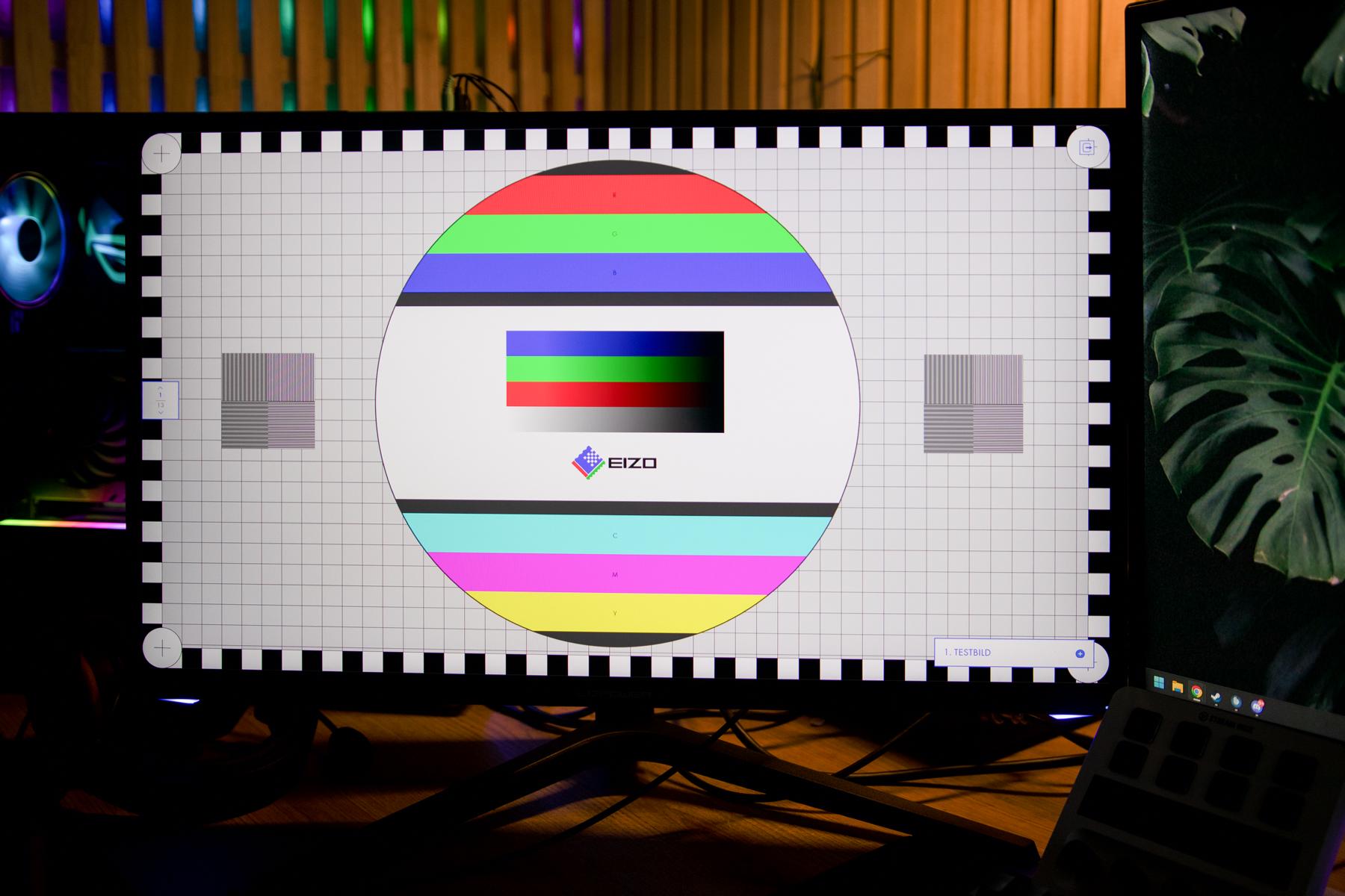 Um den Monitor gleich etwas auf die Probe zu stellen, habe ich ihn mir mit dem EIZO-Monitortest angesehen. Auf dem Testbild sehe ich klar und deutlich Linien sowie Frequenzmuster und weiche Farbverläufe. Pixelfehler kann ich in keinen Farben entdecken. Beim schwarzen Bild erkennt man auch gut die gleichmäßig verteilte Backlight-Beleuchtung. Dort gibt es, auch in den Kanten, kein Bleeding. Beim Testen von Farbabständen konnte ich nichts auffallend Negatives feststellen, was aber mit 99% sRGB-Farbraum zu erwarten war. Beim Homogenitätstest sehe ich ein gleichmäßiges Bild ohne auffällige Bereiche. Schrift ist, wie ich ja schon vorher beschrieben habe, scharf und deutlich. Beim Blickwinkelstabilitätstest des Monitors geht es darum, ab wann sich die dargestellten Kreise in Form und Größe ändern. Der Blickwinkel ist vor allem wichtig, wenn man den Monitor nicht als Hauptmonitor verwendet und ihn nicht direkt 90° vor sich aufstellt. Hier fiel mir auf, dass durch Vergrößern des Blickwinkels trotzdem alles gut erkennbar ist, was wohl am IPS-Panel liegt.