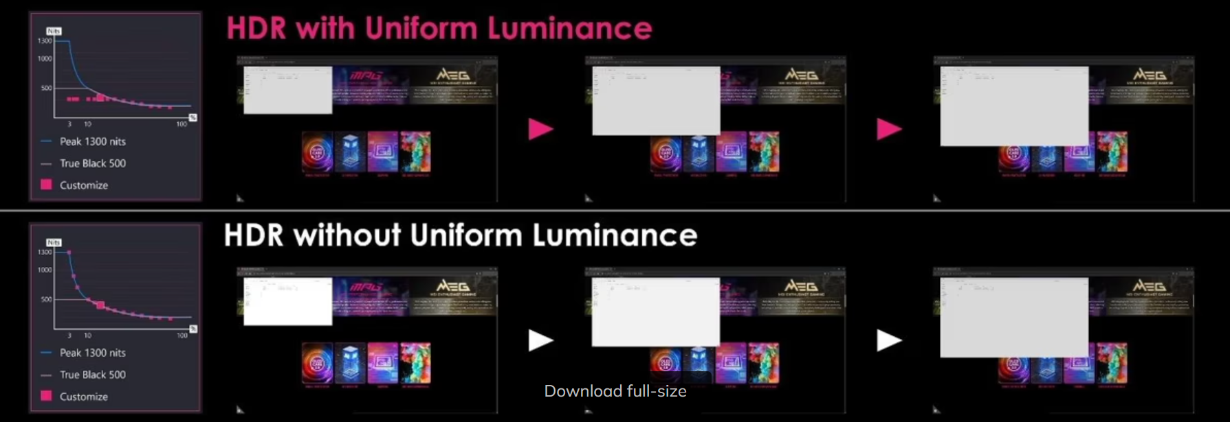 Uniform Luminance: Um die oft abrupten Helligkeitssprünge zu vermeiden, die bei Standard-HDR auftreten, können Nutzer mit dieser Funktion die HDR-Helligkeitskurve anpassen. Durch die Zuordnung bestimmter Helligkeitsstufen zu unterschiedlichen Fenstergrößen des Bildinhaltes sorgt sie für eine stabile und gleichmäßige Helligkeit in unterschiedlichen Nutzungsszenarien.