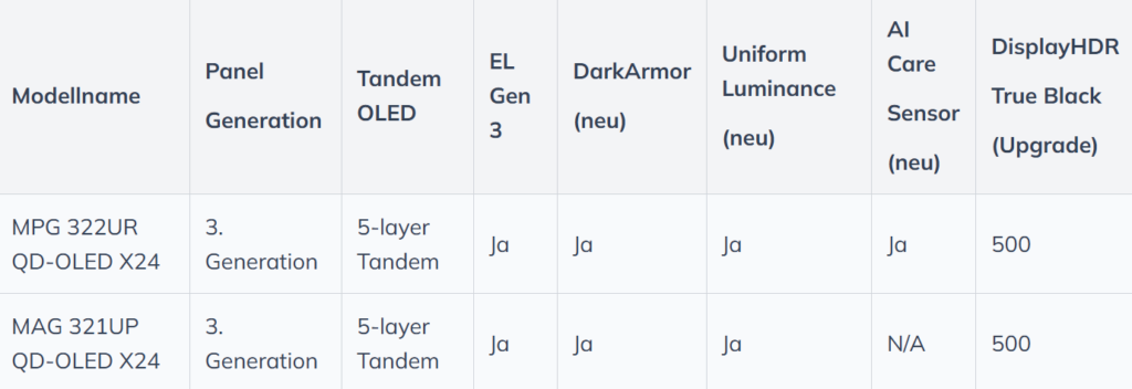 MSI hat ein großes Update für das Line-Up der QD-OLED-Monitore mit 32 Zoll und 4K-Auflösung angekündigt. Außerdem führt MSI zwei neue Displays ein, die vor allem auf Gamer zugeschnitten sind. Sowohl der MPG 322UR QD OLED X24 als auch der MAG 321UP QD OLED X24 basieren auf der aktuellen 5-Layer Tandem OLED-Architektur mit EL Gen 3-Technologie.